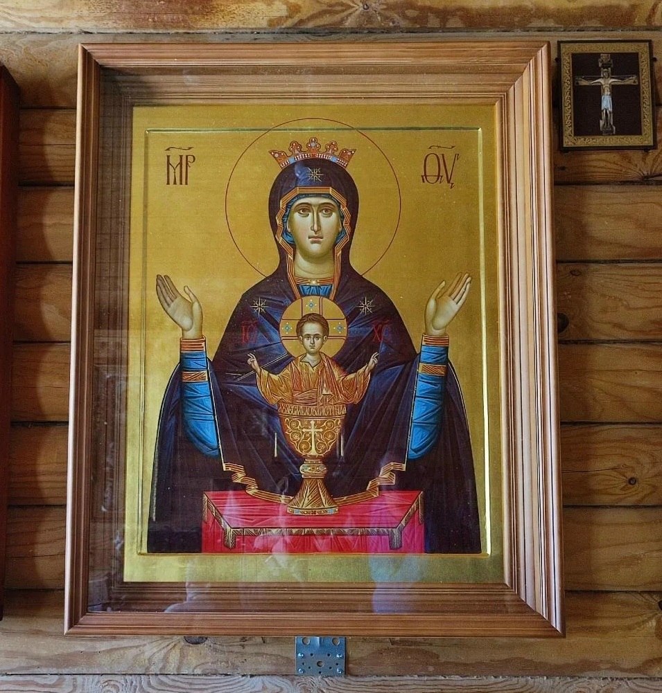 Это икона Божией Матери и Приснодевы Марии «Неупиваемая Чаша». Образ написан на золоте специально для прихода. Его размер 90 на 70.