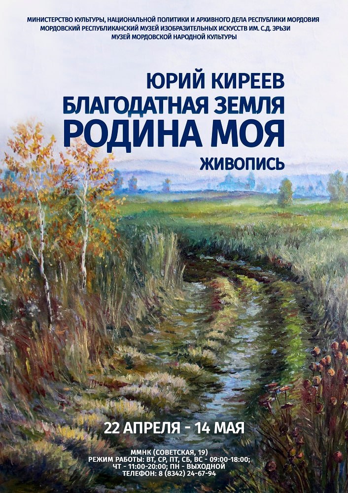 Персональная экспозиция Юрия Киреева - художника, чьё творчество пронизано любовью к родной природе. В выставке - более 50 работ: пейзажи, натюрморты, сюжетные полотна и картины святых мест Мордовии.