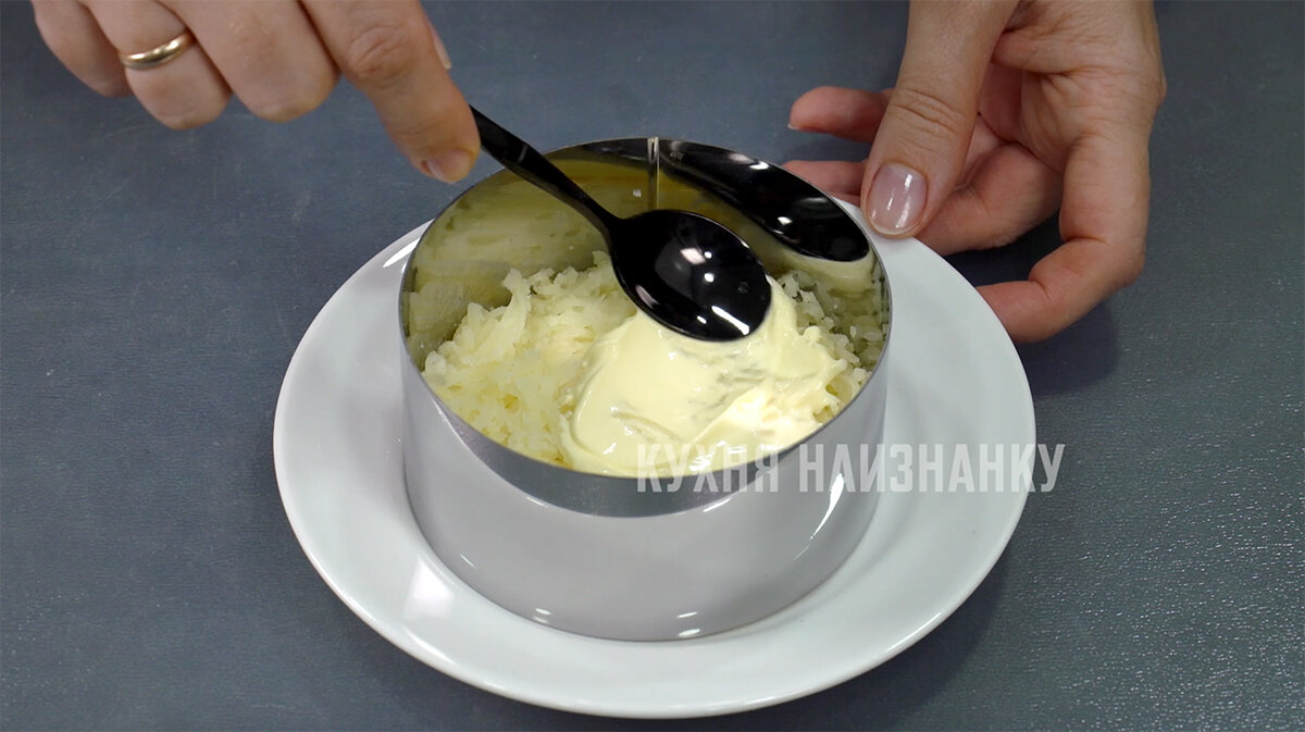 После варки, картофель очищается и натирается на мелкой терке. Это придаст салату нежность и легкость. Натертый картофель первым слоем выложите в сервировочное кольцо или просто в салатник. Не забудьте добавить небольшое количество домашнего майонеза, чтобы связать слои.