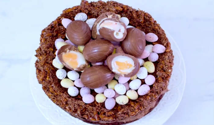 Шаг 7: Скомпоновать слои: корж с кремом, второй корж, затем зефирный верх, украшенный кренделями и шоколадными яйцами.