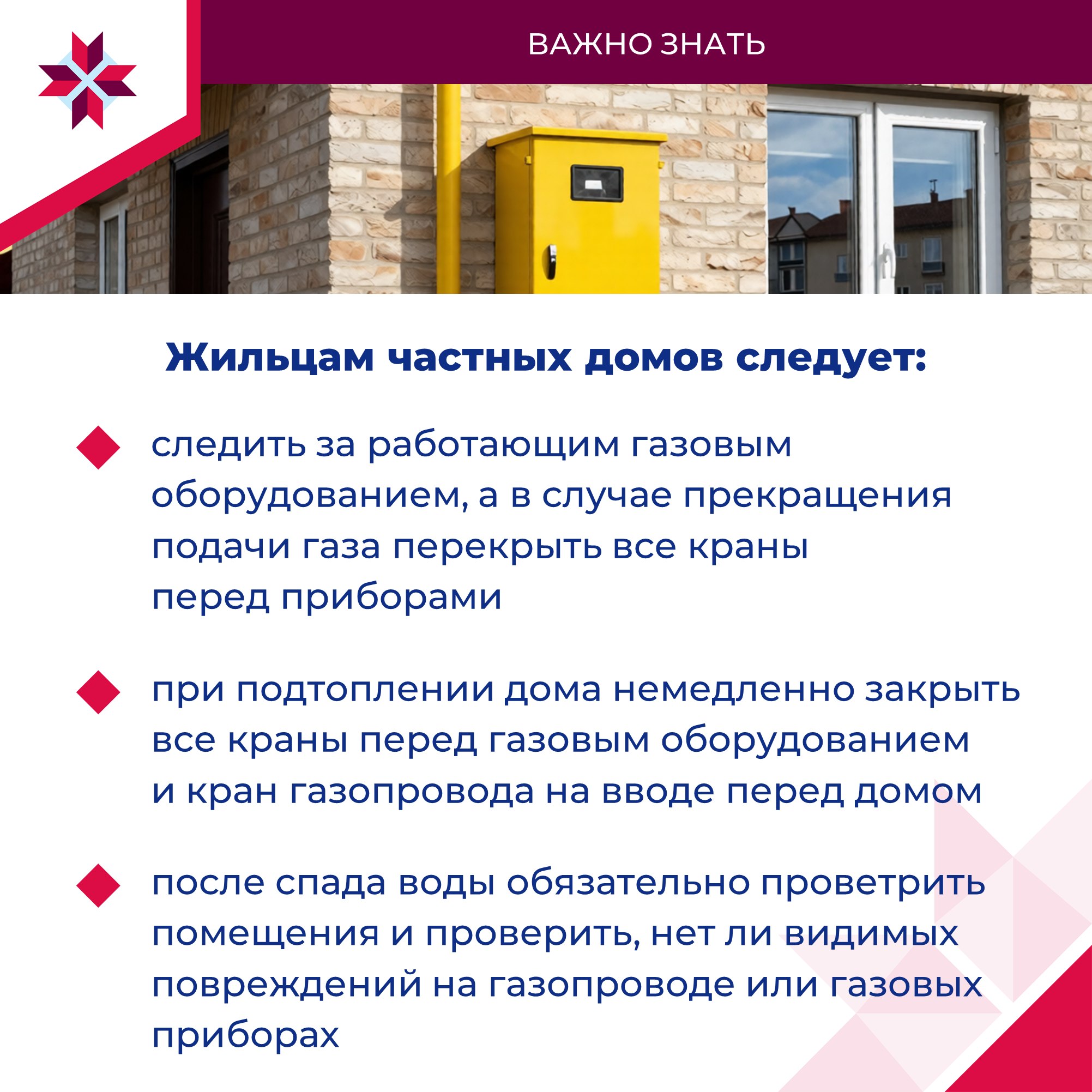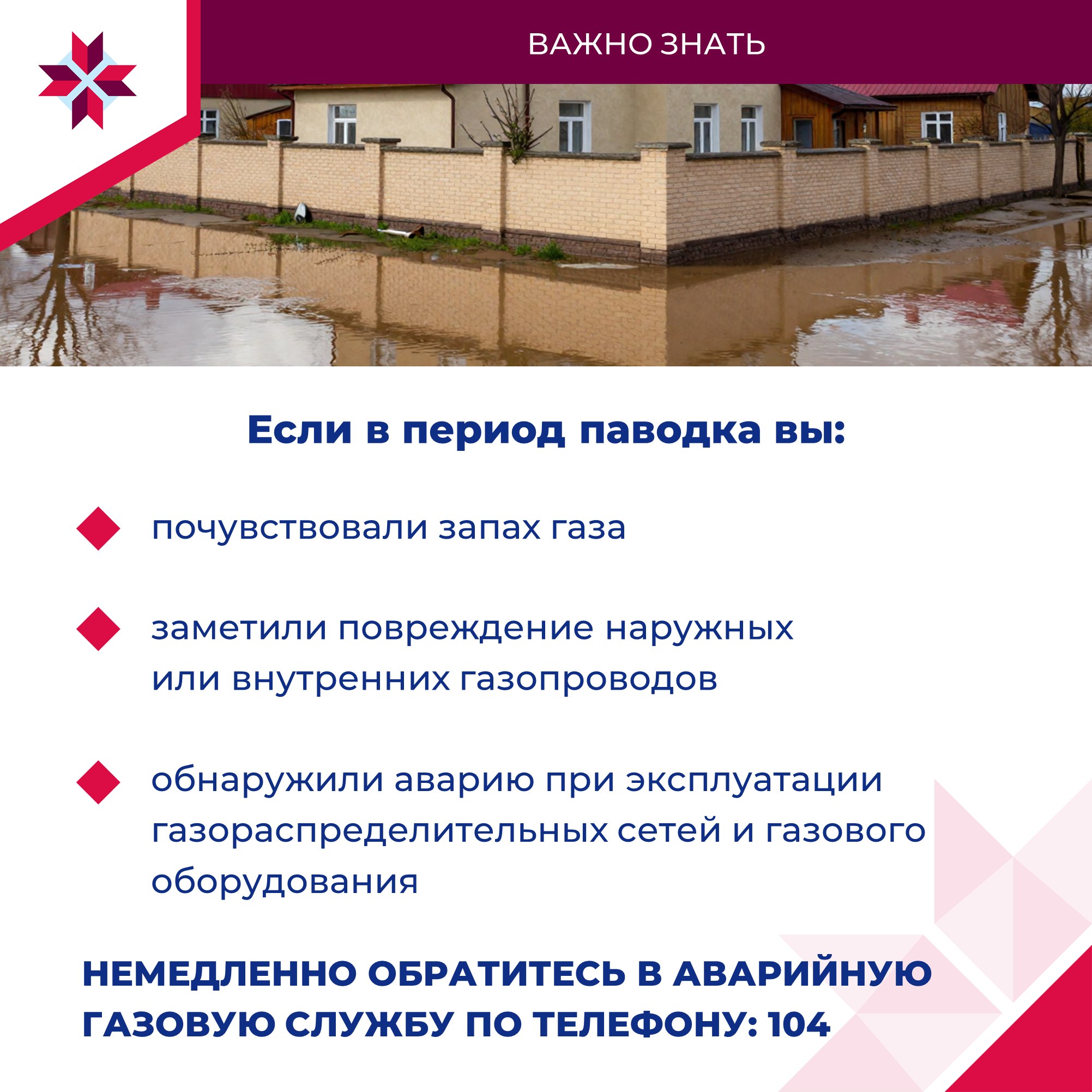 Жильцам частных домов следует быть внимательными при обращении с газовым оборудованием во время паводка. Подъём уровня воды может негативно повлиять на работу газораспределительных сетей.