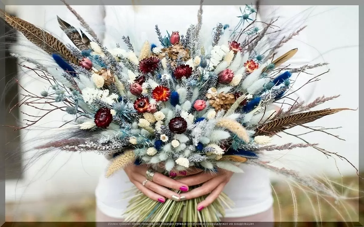 Сухоцветы отлично подходят для создания зимних композиций, венков, панно и картин, а также вносят изысканный стиль в свадебные букеты в направлениях рустик и бохо. К тому же, из них можно составлять яркие гербарии в стеклянных емкостях. При оформлении букета важно начинать с крупных цветочных акцентов, а затем заполнять пустоты нейтральными растениями.