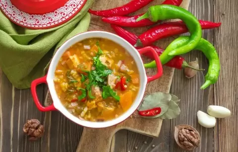 В традиционном рецепте используется говядина, грецкие орехи и ткемали, но советская версия значительно упростила состав. Вместо экзотических компонентов на помощь приходят привычные всем продукты, такие как томатная паста и рис. Этот суп будет не только сытным, но и порадует своим неповторимым, слегка кисловатым вкусом.